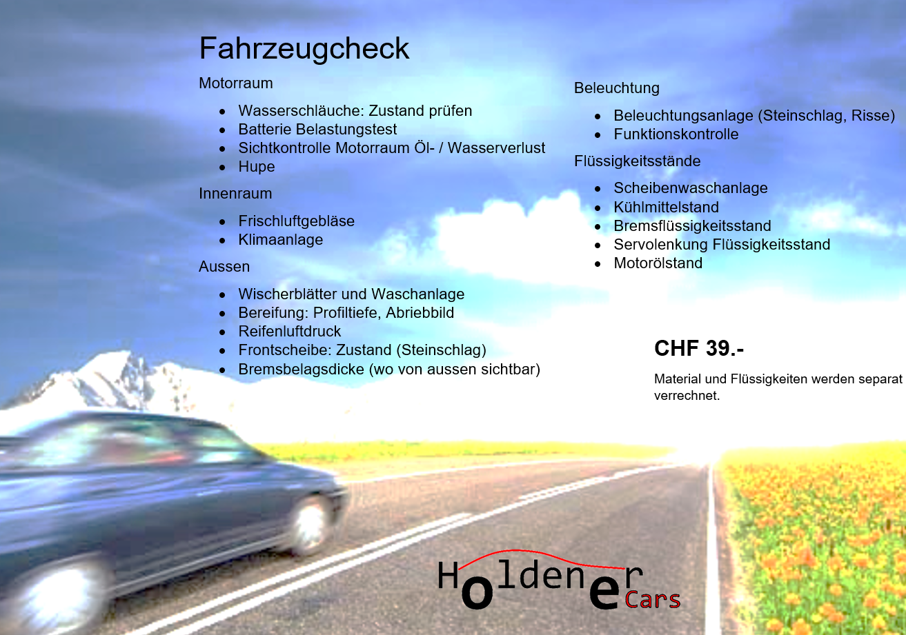 Egal, ob Ölwechsel, MFK-Vorbereitung, Bremsservice oder Unfallreparatur – bei Holdener Cars ist Ihr Fahrzeug in besten Händen. Dank moderner Ausstattung, einem grossen Ersatzteillager und einem leistungsstarken 6-Tonnen-Lift können wir Autos, Anhänger, Nutzfahrzeuge und Wohnmobile fachgerecht warten und reparieren.